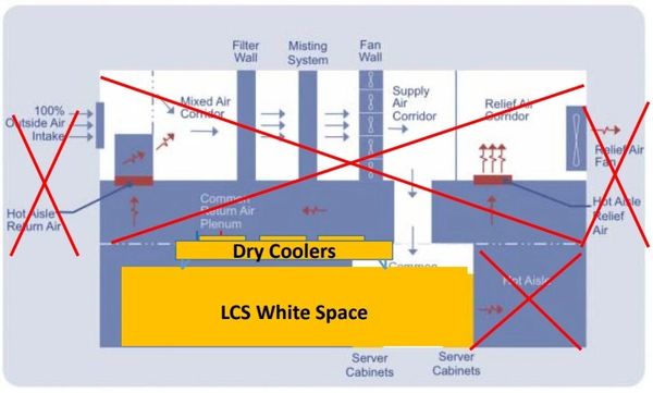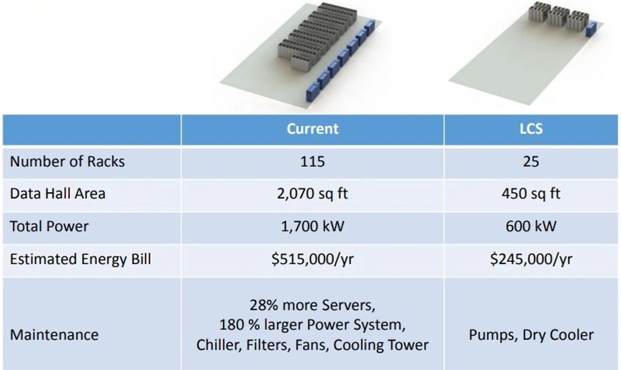 Hybrid racks facilitate transition to immersion with existing racks easily modified. Servers added one at a time as Vertical solution facilitates efficient space utilization. Maintenance access similar to air-cooled servers. Chassis solutions use 1/3 the fluid of tanks, reducing weight & cost. Retrofit a 2,000 sq. ft. datacenter for a federal government agency by introducing LSS-cooled racks during the normal IT refresh cycle. Benefit included: Any Shape or Size, No Water in Datacenter, Scalability, Easy to Swap & Maintain Devices, Harsh Environment Deployments, Low Cost.